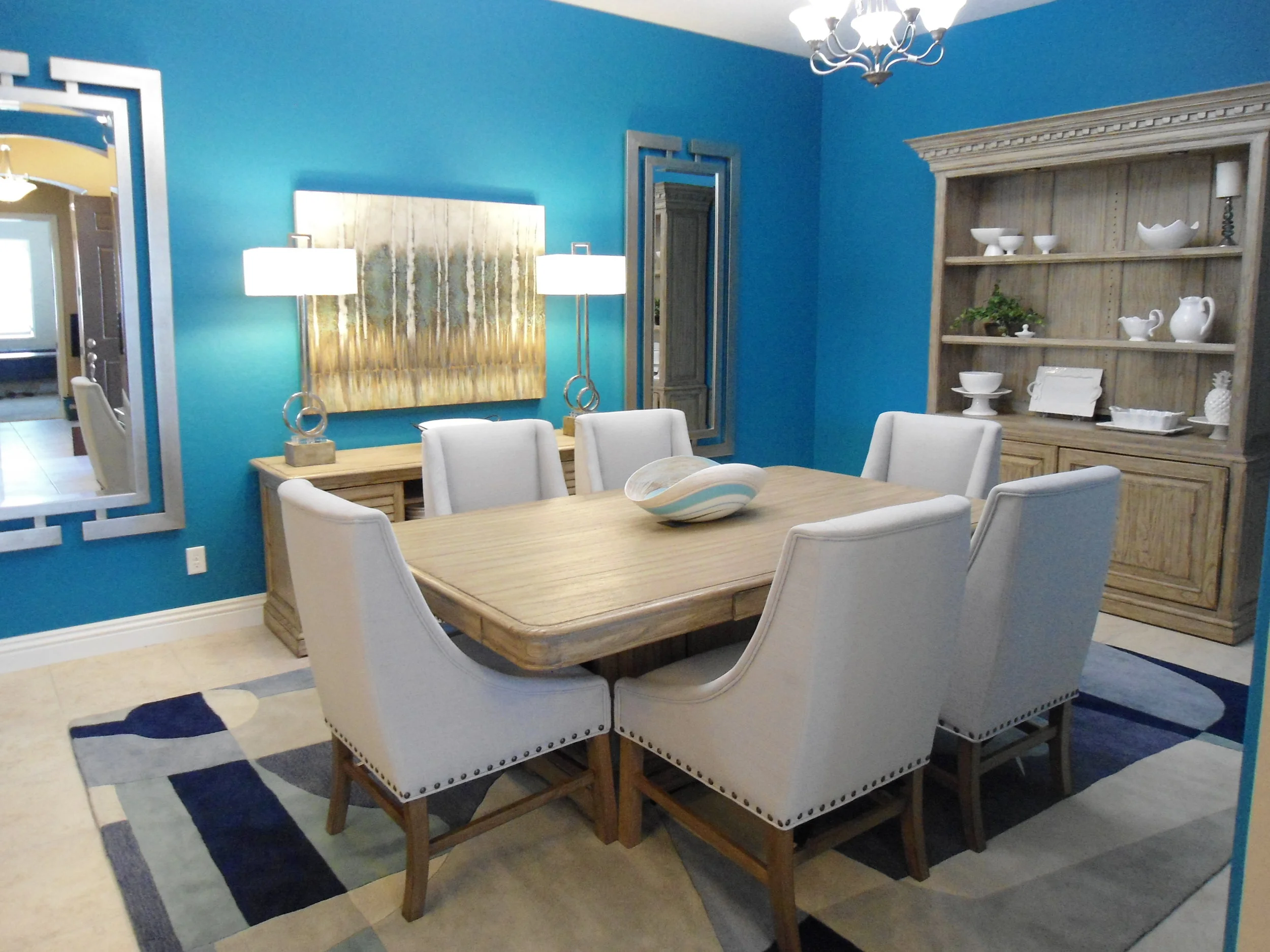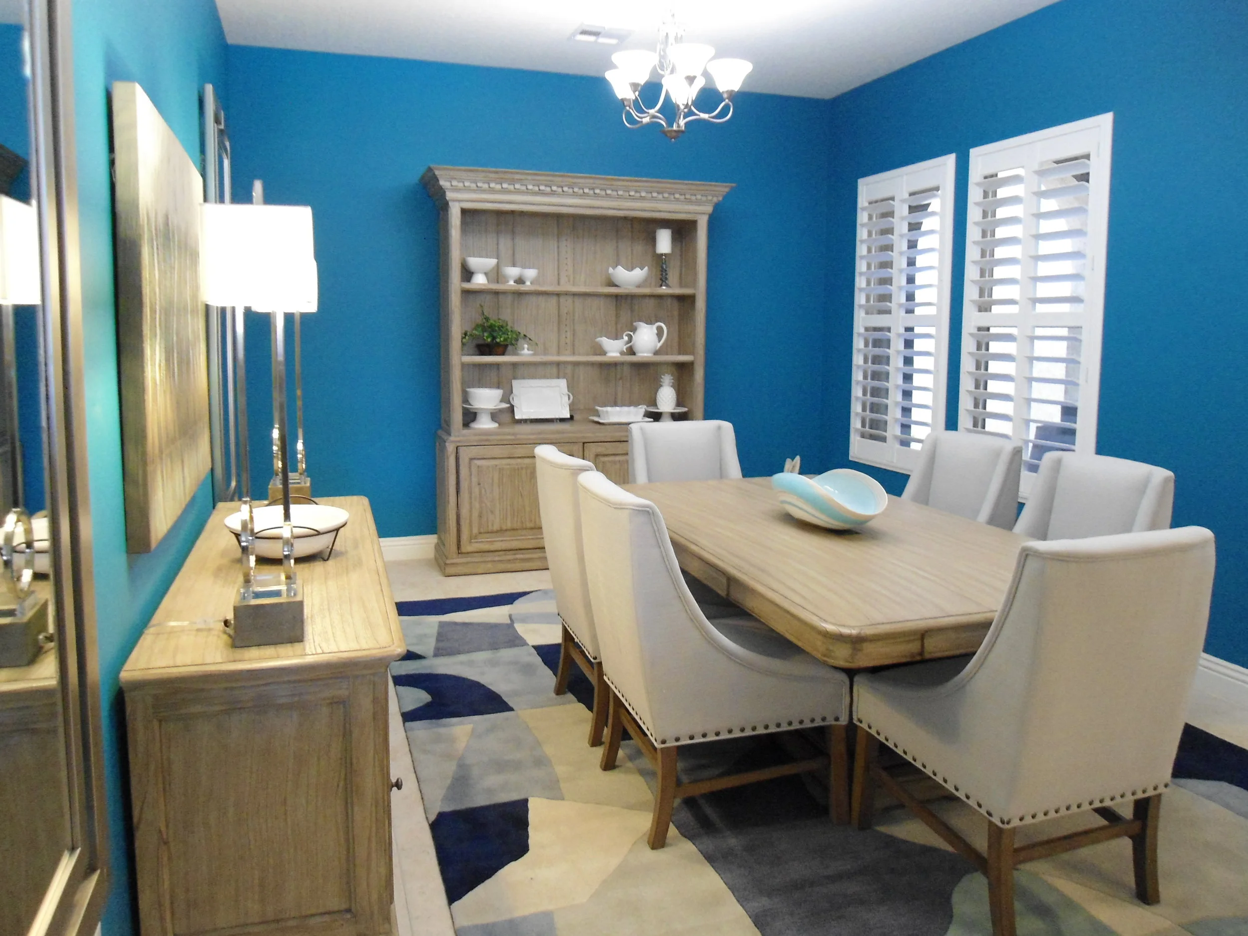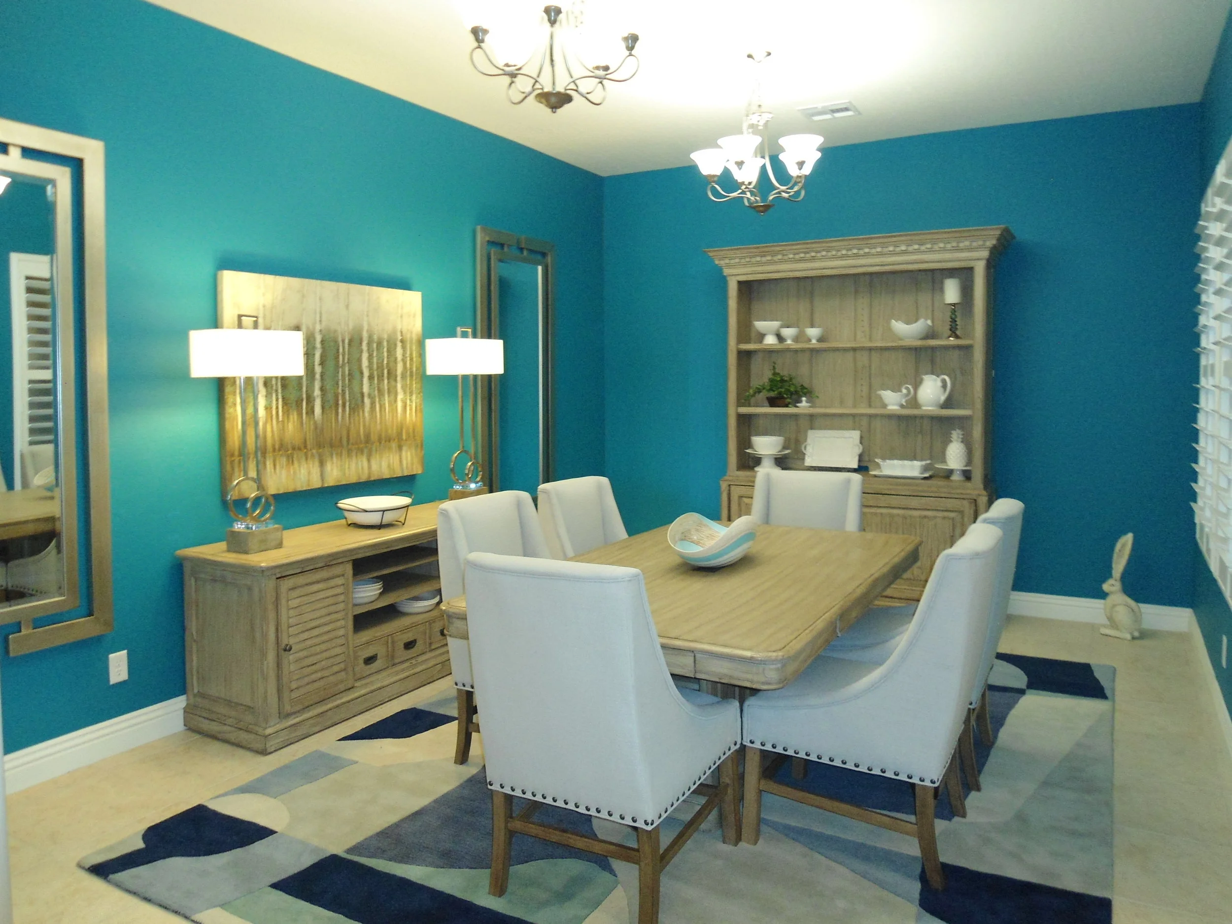 The client wanted to use furniture items previously utilized in their home office, so we added chairs, area rug, art, mirrors, and lamps to dress up the space. Painting the walls deep aqua made the room go from drab to wow!!